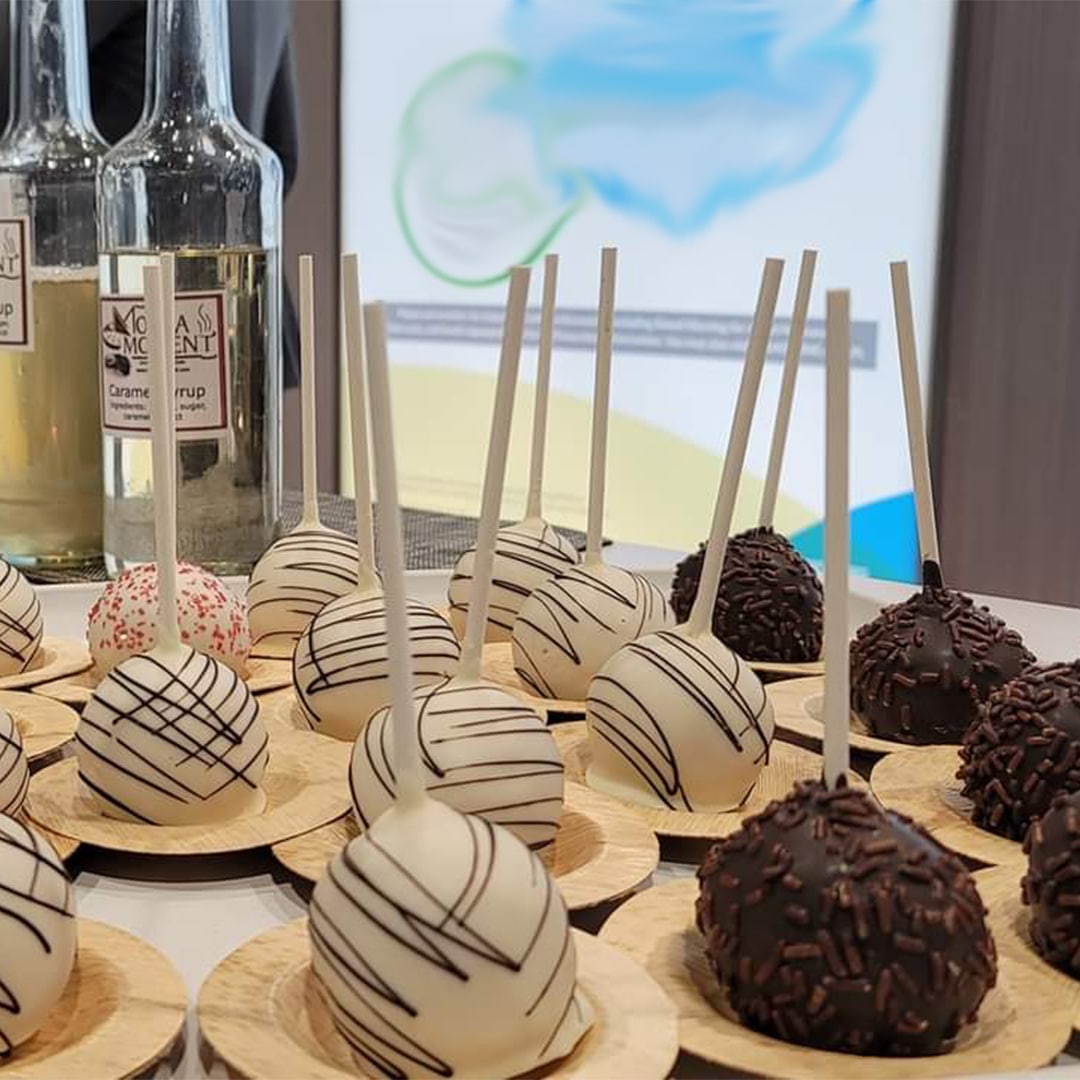 Our s’more pops service features toasted marshmallows with golden drizzle atop rich chocolate cookie crumbs that create nostalgic booth magnets. The campfire-inspired presentation on elegant wooden boards provides Instagram-worthy moments while offering interactive, handheld treats that spark childhood memories. These premium comfort confections transform casual attendees into engaged prospects who linger to savor the familiar flavors and discuss your business solutions.