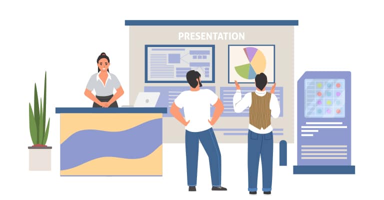 - Create interactive presentations: Make touchscreen displays that visitors can use on their own, like using a giant iPad. Organize the information into clear groups, like chapters in a book. When no one’s using it, have it show eye-catching animations, like an arcade game attract mode.